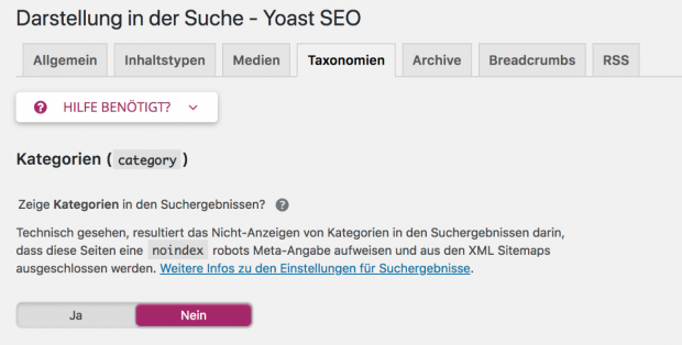 Im Bestfall sollte man also strategisch Kategorien oder Tags entsprechend einer Keywordrecherche vergeben und diese mit passenden Kategoriebeschreibungen inhaltlich aufwerten. Alternativ kann man die Indexierung dieser Taxonomie-Seiten über ein SEO-Plugin verhindern.