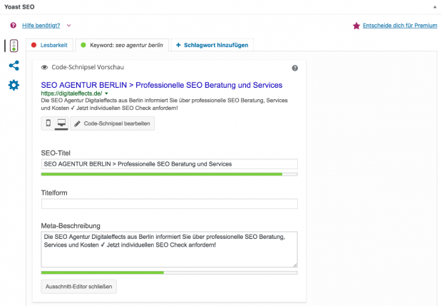 WordPress-SEO-Plugins wie Yoast SEO ermöglichen die gezielte Optimierung von TITLE und Meta-Description (Screenshot: digitaleffects.de / Yoast)