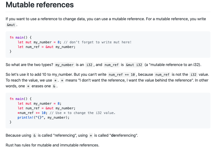 In der Folge werden die verschiedenen Datentypen in Rust behandelt, es gibt ein Kapitel über Debugging, eines über Memory Allocation und mehrere über verschiedene Programmlogiken. Die einzelnen Punkte werden durch teilweise sehr ausführliche Programmsnippets illustriert – worum es überhaupt geht und was der Code jeweils bewirkt, wird kontinuierlich in einfachem Englisch beschrieben, wie hier in diesem Auszug über mutable references: