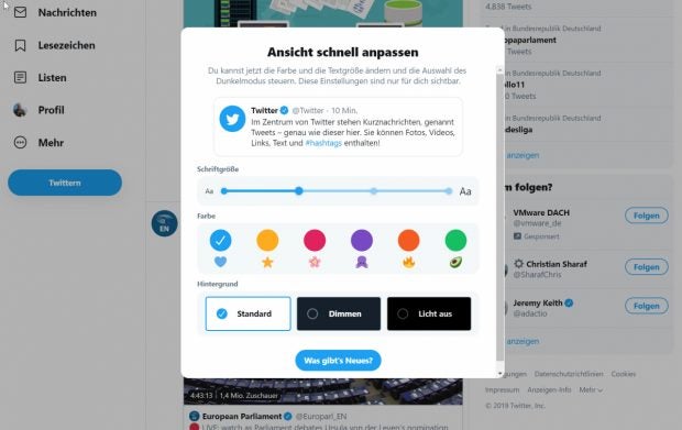 Hier wird etwa die Schriftart oder die Akzentfarbe bequem eingestellt. Ebenso lässt sich der Hintergrund dimmen und auf Schwarz stellen – laut Twitter war das ein häufig geäußerter Nutzerwunsch.