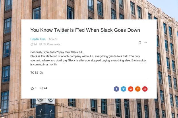 Auf Blind, einer anonymen Arbeitsplatz-Chat-App, wurde das Verschwinden der Tools mit einer Mischung aus Unglauben, Frustration und Schadenfreude von Menschen kommentiert, die sich als Twitter-Angestellte ausgaben: „Wir haben wohl unsere Slack-Rechnung nicht bezahlt. […] Die Insolvenz kommt in einem Monat“, schrieb einer. „Seltsamerweise ist es die Slack-Deaktivierung, die mich dazu gebracht hat, mich endlich woanders zu bewerben“, so eine andere.