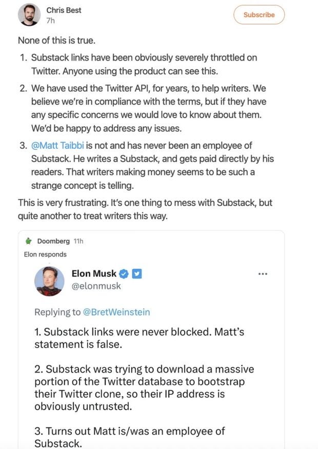 Die Substack-Chefs verneinten sowohl, dass sie die „Twitter-Datenbank downloadeten“, als auch, dass Taibbi ihr Angestellter gewesen sei. Sie sagten, die „Twitter-Situation“ sei „frustrierend“. Später bestätigten sie, dass die Anti-Substack-Maßnahmen anscheinend wieder zurückgefahren worden waren. Musk veröffentlichte in einem Chat mit einem anderen „Twitter Files“-Autor namens Michael Shellenberger einen Auszug aus seiner privaten Konversation mit Taibbi. Später löschte er den Tweet wieder.