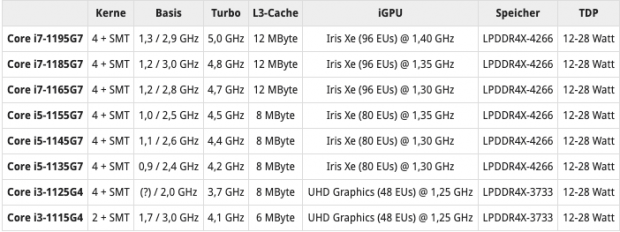 Mit dem Core i7-1195G7 gibt es ein neues Topmodell, welches den bisherigen Core i7-1185G7 (Test) ablöst. Der Basistakt (bei 28 Watt) fällt 100 Megahertz niedriger aus, dafür wurde der Singlecore-Turbo um 200 Megahertz gesteigert und der Allcore-Boost um 300 Megahertz. Solche Frequenzen liegen aber selbst bei 28 Watt nur kurzfristig an, die 50 Megahertz mehr der iGPU dürften dauerhaft erreichbar sein.