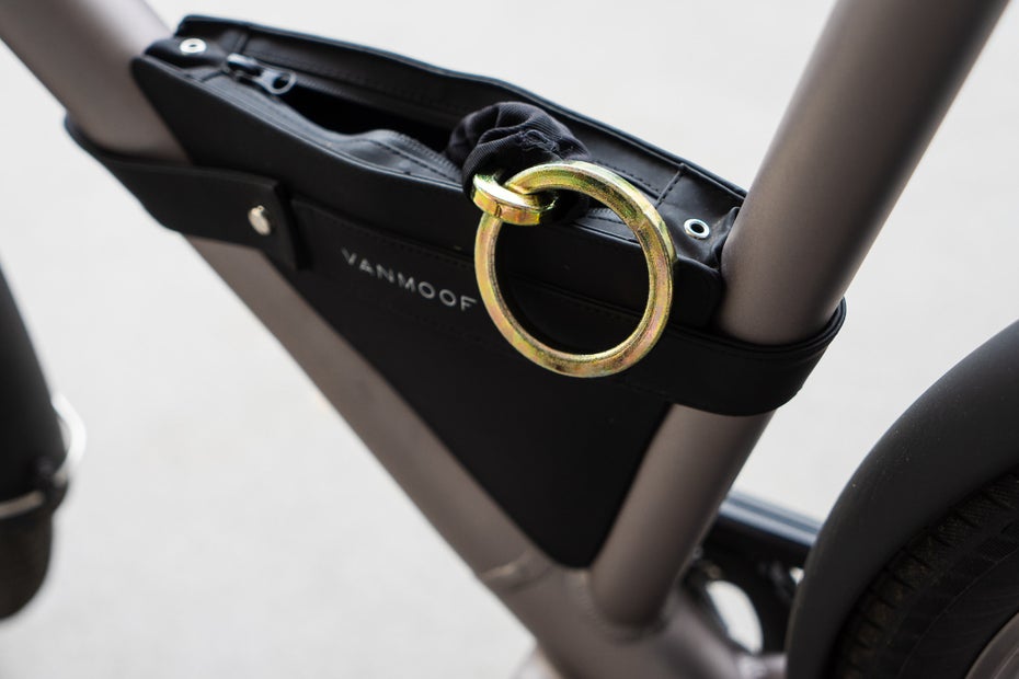 Ohnehin fällt kaum auf, dass es sich hier um ein E-Bike handelt: Sowohl Akku als auch Motor (250 Watt) sind unauffällig im eloxierten Alurahmen beziehungsweise in der Frontnabe untergebracht. Auf dem Oberrohr ist ein Touch-Display integriert, das den Ladestand und die Fahrstufe anzeigt. Außerdem lässt sich durch Berühren des Displays das Schloss entsperren. Am unteren Teil des Rads befindet sich eine Tasche, in der das robuste Kettenschloss von Vanmoof verstaut werden kann.