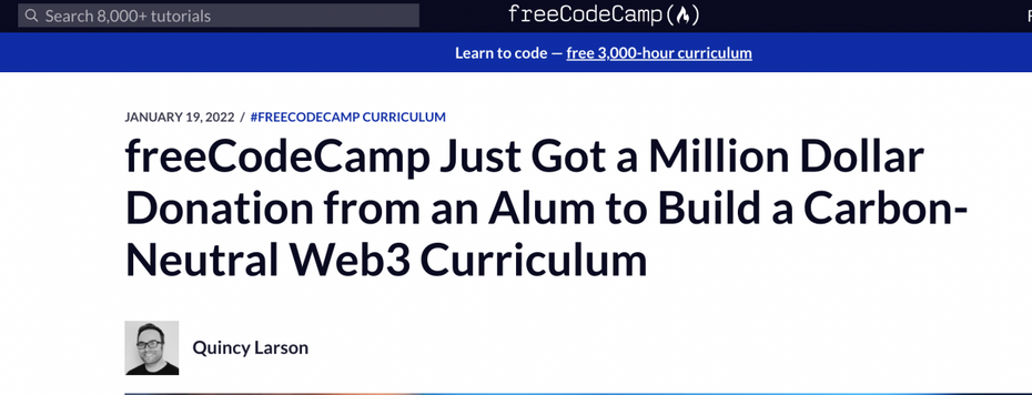 Auch Freecodecamp plant, in Kürze einen Lernpfad zum Thema Web3 zu launchen. Finanziert wird dieser durch die Spende eines ehemaligen Freecodecamp-Nutzers, der der Community mit einer Spende von einer Million Dollar für das Projekt offenbar etwas zurückgeben möchte.