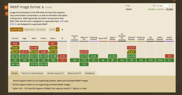 Mittlerweile hat sich die Situation aber drastisch geändert. Unter Windows unterstützt nur mehr der insgesamt nicht mehr unterstützte IE das Format nicht, unter allen anderen Betriebssystemen müsstet ihr schon veraltete Browser verwenden, um auf WebP zu verzichten.