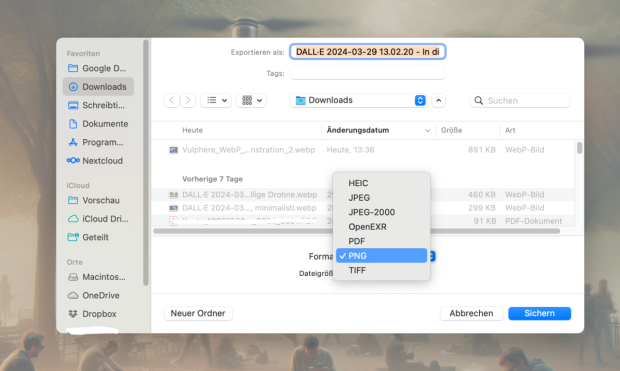 Unter macOS ruft ihr die Bord-App Vorschau auf, öffnet darin das WebP-Bild und wählt dann Ablage > Exportieren. Ihr erhaltet eine breite Auswahl möglicher Formate.