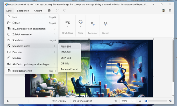Entsprechend ist es für die mitgelieferten Bordmittel der großen Betriebssysteme auch kein Problem mehr, solche Bilddateien zu verarbeiten. Für euren Anwendungszweck, Bilder von WebP in PNG oder JPG zu konvertieren, müsst ihr aber nicht lang suchen. Unter Windows verwendet ihr einfach das Bordprogramm Paint. Darin öffnet ihr das WebP-Bild und wählt direkt Datei > Speichern unter und dann das gewünschte Format.