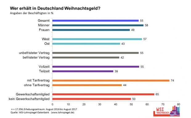 Rund drei Viertel aller Mitarbeiter in Betrieben mit Tarifvertrag erhalten Weihnachtsgeld, während der Anteil in Unternehmen ohne Tarifvertrag nur bei 44 Prozent liegt, heißt es in der Umfrage. „In nicht-tarifgebundenen Betrieben wird das Weihnachtsgeld zudem oft nur als freiwillige Zahlung geleistet, die vom Unternehmen wieder eingestellt werden kann“, erklärt Thorsten Schulten von der Hans-Böckler-Stiftung. In tarifgebundenen Betrieben hätten die Beschäftigten dagegen in der Regel Anspruch auf Weihnachtsgeld. Erhebliche Unterschiede gibt es auch zwischen den alten und neue Bundesländern.