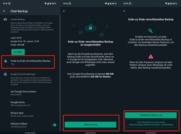 Die Backupverschlüsselung müsst ihr jedoch selbst in den Einstellungen unter Chats aktivieren. Bei der Aktivierung müsst ihr ein Passwort festlegen. Das könnt ihr euch entweder selbst ausdenken – oder ihr nutzt den von der App generierten 64-stelligen Code. Beides solltet ihr sicher verwahren, denn verliert ihr das Kennwort, ist auch euer Backup futsch.