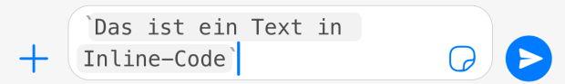 Texte im Inline-Code haben einen höheren Zeichenabstand und Monospace-Serifen. Außerdem ist der Hintergrund leicht eingegraut. Die Funktion lässt sich besonders gut für die Darstellung von Computer-Code-Zeilen verwenden. Sie kann aber auch gut zum Hervorheben von Text genutzt werden. Um einen Text in Inline-Code zu schreiben, setzt du ein Backtick-Gravis (`) vor und nach dem Absatz.