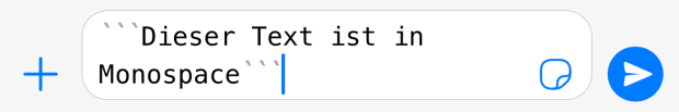 Schrift in Monospace hat überall den gleichen Abstand zwischen allen Zeichen. Der Buchstabe I bekommt dann genau so viel Platz wie der Buchstabe D. Im Deutschen ist die Schriftart auch als nichtproportionale Schriftart bekannt. Die Monospace-Schrift kann bei Whatsapp sehr nützlich sein, auch wenn sich der Vorteil nicht sofort erschließt. Denn Texte in Monospace können ohne großem Aufwand formatiert werden. So können beispielsweise Tabellen auch in Schriftform dargestellt werden. Auch Einrückungen, Wortlängen und Zifferreihen aus der Code-Sprache können durch diese Formatierung besser dargestellt werden. Um einen Text in Monospace zu setzen, musst du vor und nach deinem Text drei Gravis-Zeichen (`) setzen.