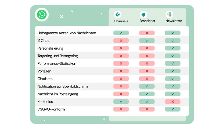 Über die Business-App hast du zwei Marketing-Optionen: Broadcast-Listen und neuerdings auch Whatsapp-Channels. Beide Varianten sind gratis, aber garantieren keinen Datenschutz und bieten nur limitierte Optionen fürs Marketing.