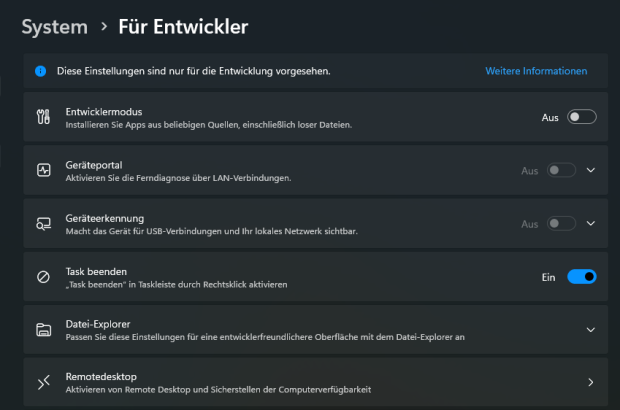 - Etwa in der Mitte der nun aufgetauchten Menüpunkte findet ihr den Bereich „Für Entwickler“. Wählt diesen aus.