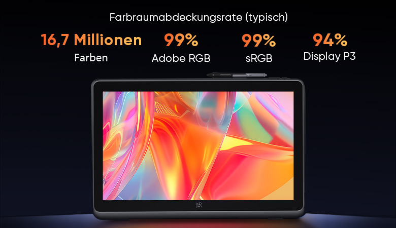 Das Display kommt ab Werk farbkalibriert und Calman-verifiziert, sodass exakte Farben und Graustufen angezeigt werden. Die vollständig laminierte AG-Nano-Ätzglas-Oberfläche reduziert Reflexionen und verleiht ein papierähnliches Gefühl beim Zeichnen. Der minimale Abstand zwischen Stiftspitze und Cursor verbessert das visuelle Zeichengefühl.Im Treiber kann man den Farbraum des Displays justieren – ob Adobe RGB, sRGB, Display P3 oder seine eigene Anpassungen vornehmen. Der integrierte stabile Standfuß lässt das Pen Display in die unterschiedlichsten Winkel aufstellen – von der flachen Zeichenposition bis hin zu einer aufrechten Variante. Der untere Gehäuserand ist ergonomisch keilförmig gestaltet und bieten somit einen angenehmen Übergang zur Arbeitstischfläche.