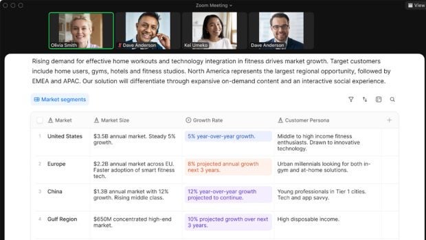 Der KI-Helfer kann beispielsweise ein Meeting zusammenfassen und diese Zusammenfassung einem Zoom Doc hinzufügen oder ein neues Doc mit allen Beteiligten teilen. Er kann auch Informationen aus Zoom-Chats und aus anderen Zoom Docs ziehen. Darüber hinaus kann er Tabellen erstellen, was den Dokumentationsprozess vereinfacht.