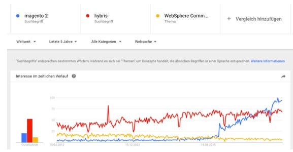 Suchhäufigkeiten gemäß Google Trends von Magento 2 im Vergleich zu hybris und IBM Websphere Commerce als internationale Wettbewerber.